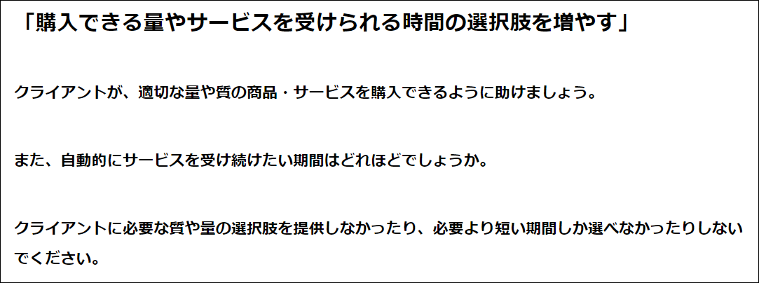 クライアントが、必要としている質や量の選択ができなかったり、望んでいるよりも短い期間しか選べなかったりしないでください。